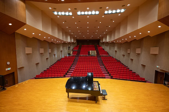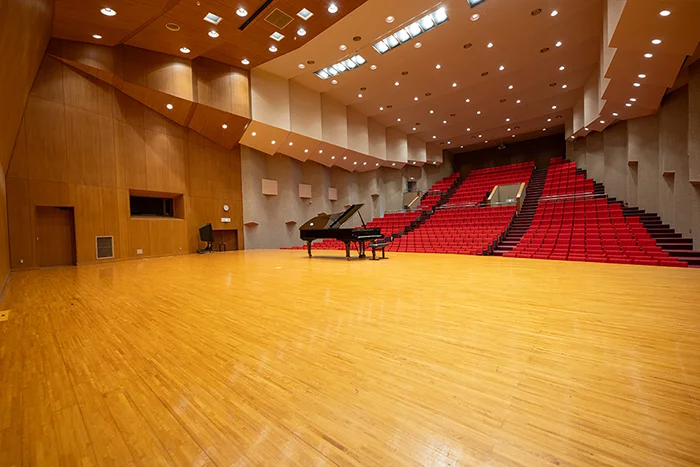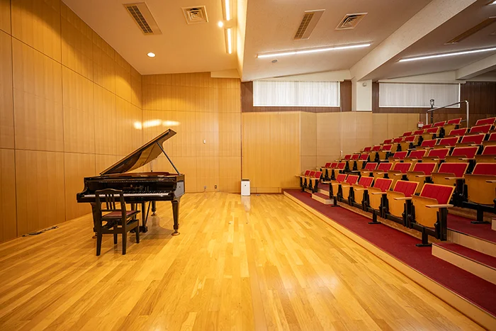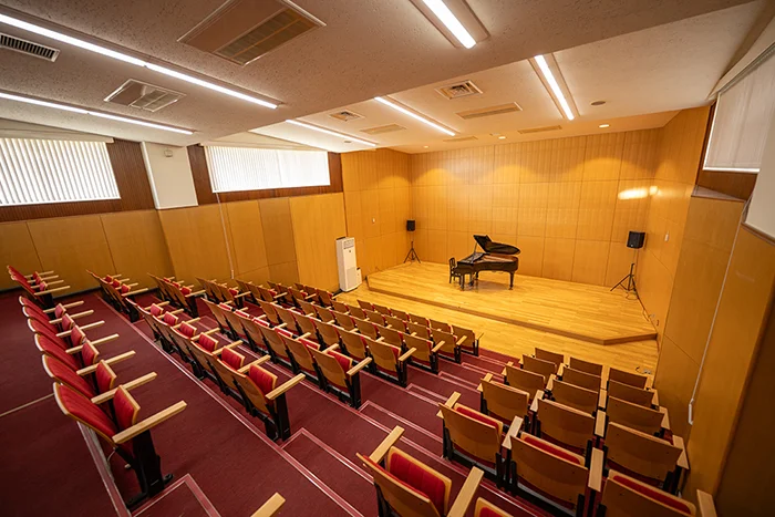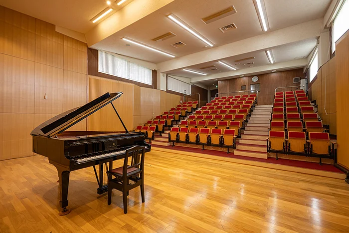 日本一のクラシック環境を目指し、音響設計をNHK技術研究所に依頼して完成した本格的なホールで、世界的なピアニストからも絶賛される音響性能を誇ります。スタインウェイなどの名器も備え、音楽公演に最適です。本ホールは、郊外の静かな環境にあり、508席の客席と、来場者に安心な500台収容の無料駐車場を完備。演奏会やコンサートはもちろん、講演会・シンポジウム、学会・研究発表会、式典、地域の文化イベント・発表会など、多目的にご利用いただけます。本校関係者から地域の皆さままで親しまれる、利便性と快適さを兼ね備えた「開かれたホール」です。