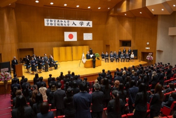 4月2日(水)、桜が満開の長坂キャンパス須賀友正記念ホールにて、宇都宮共和大学(シティライフ学部、子ども生活学部)と宇都宮短期大学(音楽科、人間福祉学科、食物栄養学科)の合同入学式が行われました。